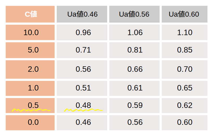 高気密住宅の最大のメリットは、室内の温度や湿度をコントールしやすさにあります。せっかく高い断熱性能を導入してもC値が大き(隙間が大きい)ければ、真価を発揮することはできません。暖かいダウンコートを着て前ボタンやチャックを開けている状態と同じです。下表のように、C値が計算上のUa値に大きく影響するのです。つまり、高気密住宅は快適かつ光熱費の掛からない省エネな生活をする上で、気密性能(C値)はとても大切な性能なのです。