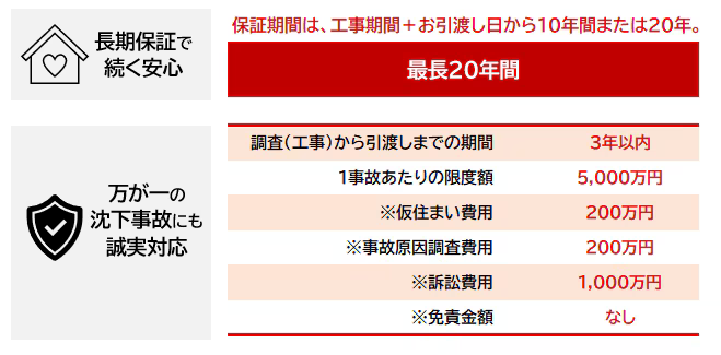 不同沈下しない地盤品質を最長20年間保証するサービスです。万が一、不同沈下が起きた場合は、沈下修正費用、不具合箇所の工事費用、そして最大2ヶ月の仮住まい費用などが補償されます。この保証は、地盤調査・解析に基づき最適な基礎仕様や対策を提案することで実現され、建築中の事故にも対応しています