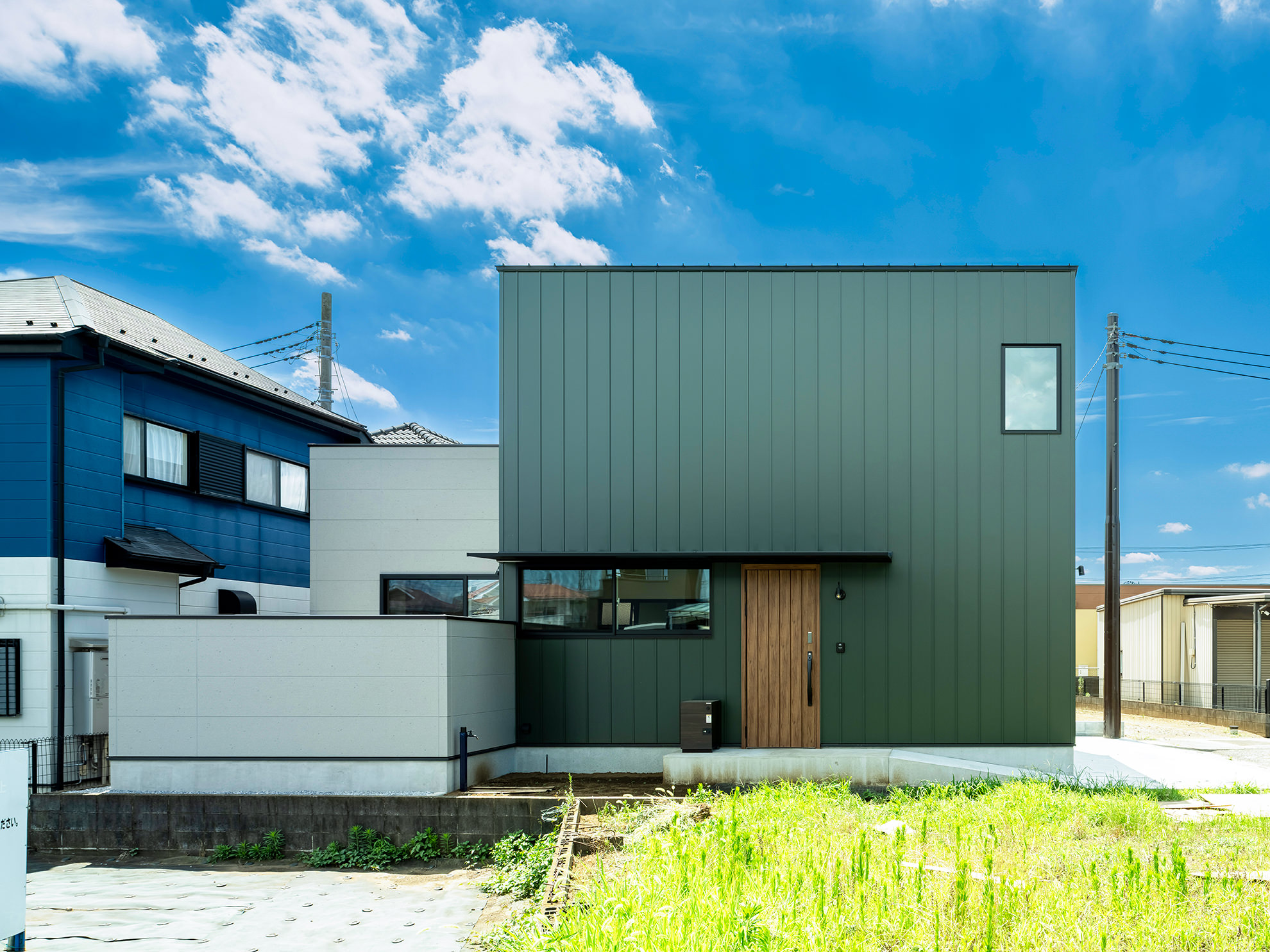 3. 街並みに馴染むモダンな外観 目を引くのは、深いモスグリーンの外壁。無機質なガルバリウムもグリーンによって周囲の環境に溶け込む落ち着いた佇まいを実現しました。