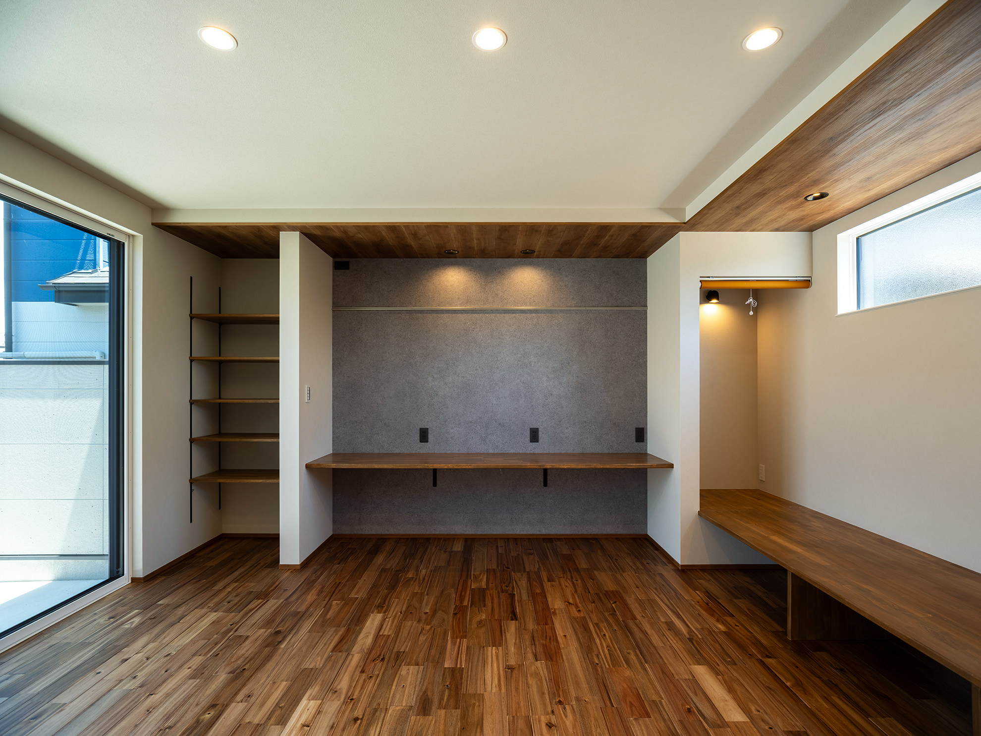 • こだわりのスタディスペース: リビングの一角に設けられた広いデスクカウンターは、家族が自然と集まる場所に。